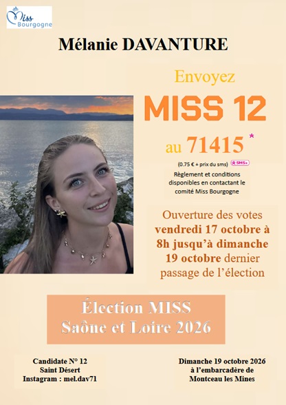 Nous avons le plaisir de vous annoncer qu’une jeune fille de notre commune, Mélanie DAVANTURE, est candidate à l’élection de Miss Saône-et-Loire 2026.