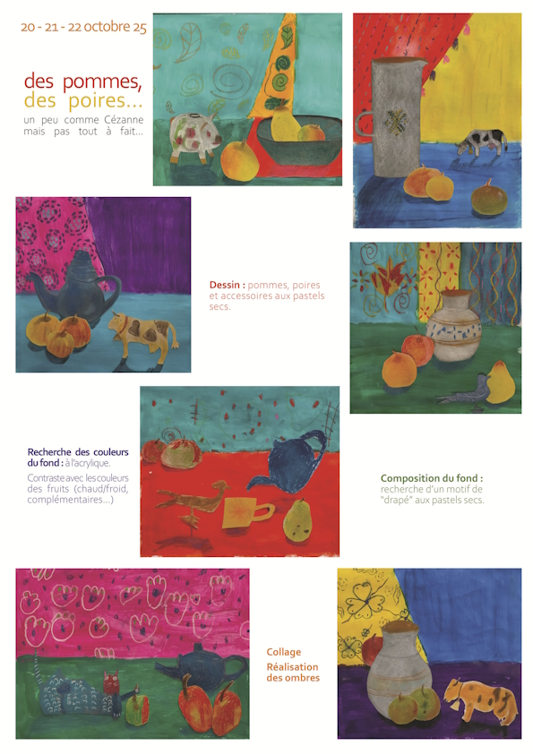Cet atelier est animé par Marie-Anne Wettstein lors des petites vacances scolaires de la Toussaint, de Février et de Printemps sur trois matins de 10h à midi. Un thème est proposé à chaque stage et permet d'aborder des techniques artistiques différentes.
