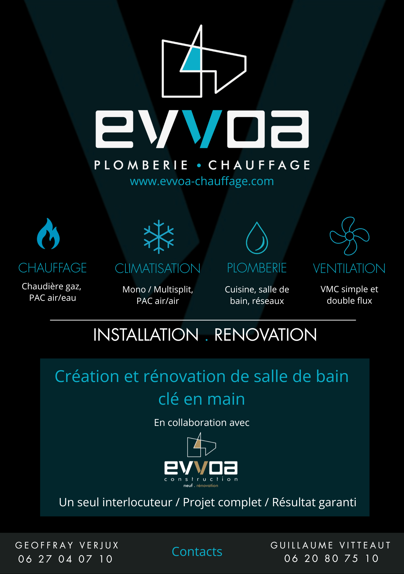 EVVOA PLOMBERIE CHAUFFAGE est une entreprise spécialisée dans les travaux de plomberie sanitaire, sur des installations complètes ou dans le cadre de rénovation de salles de bain ou de cuisines par exemple. Elle est également spécialisée dans les travaux de chauffage comme l’installation de pompes à chaleur, chaudières et climatisations.